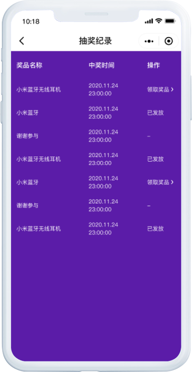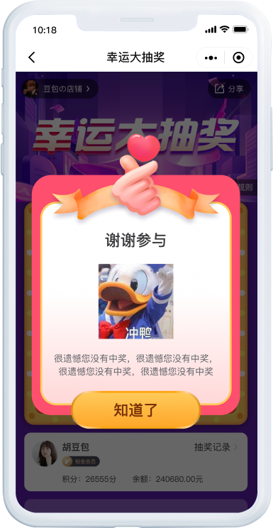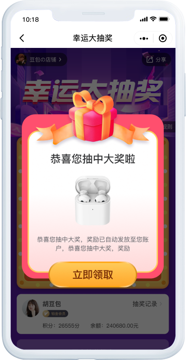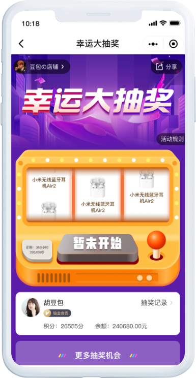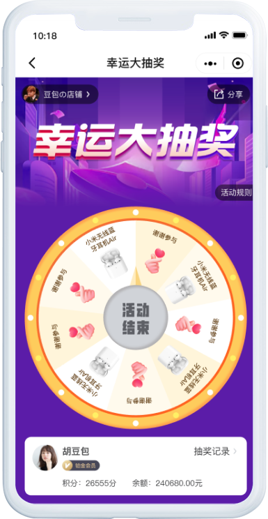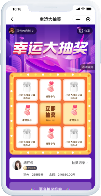 可自定义活动名称和页面背景,灵活配置活动奖项和中奖概率,让一切尽在掌握。