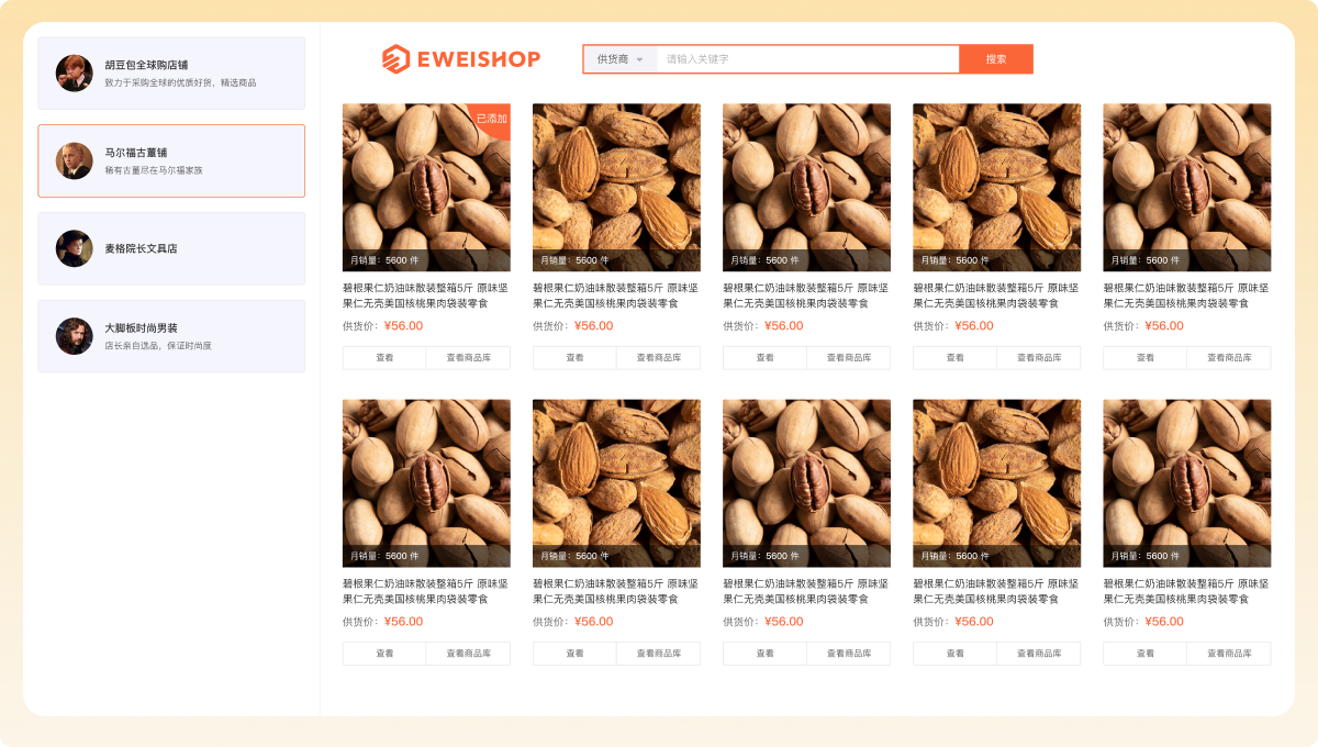 平台搭建带货市场后,可入驻和管理供货商和带货商,帮助用户解决货源和推广问题。